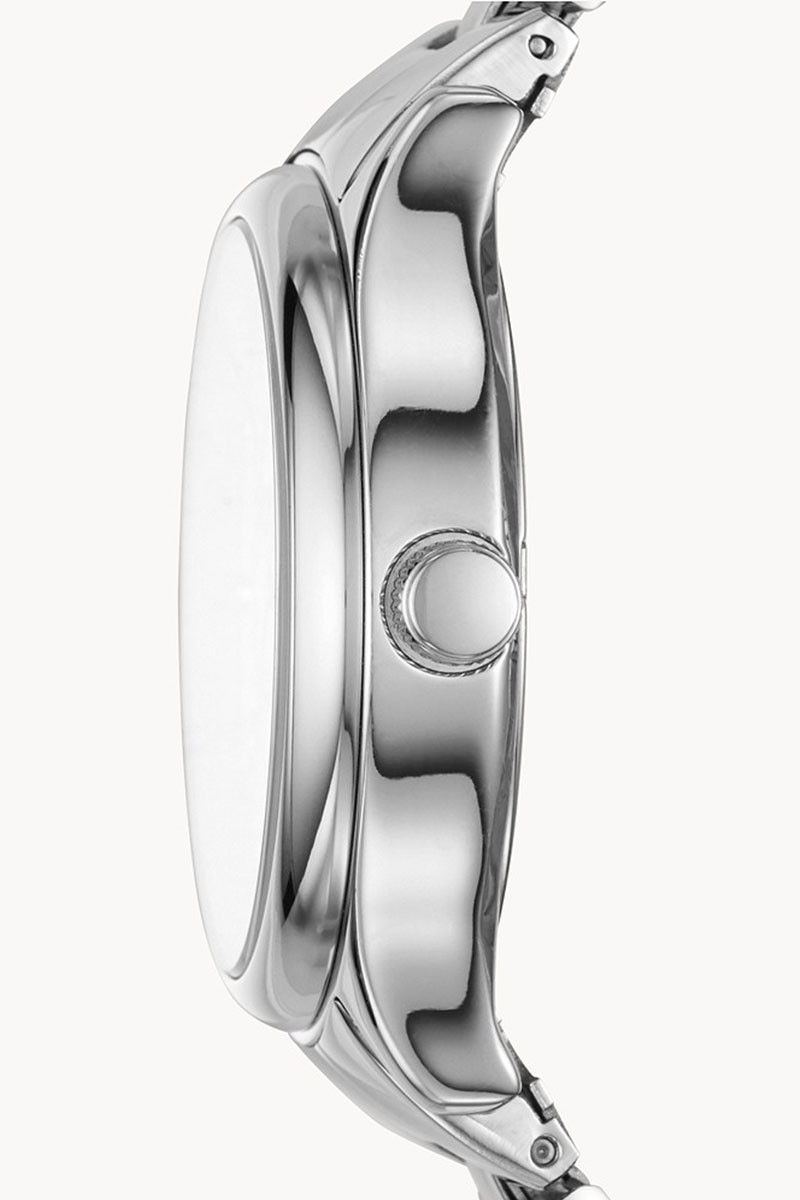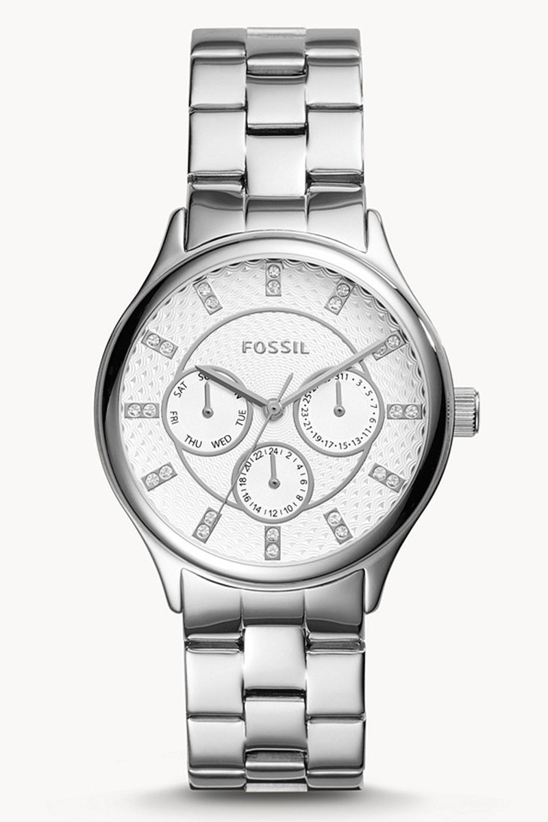 36mm Fossil multifunkcijski ženksi sat sa srebrnim brojčanikom i srebrnom narukvicom od nerđajućeg čelika.