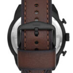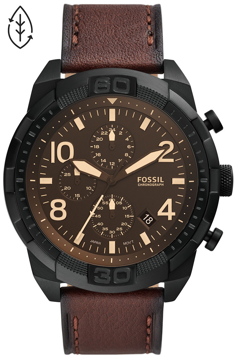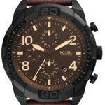 Fossil Bronson muški hronograf sa braon brojčanikom, crnim kućištem i braon kožnom narukvicom.