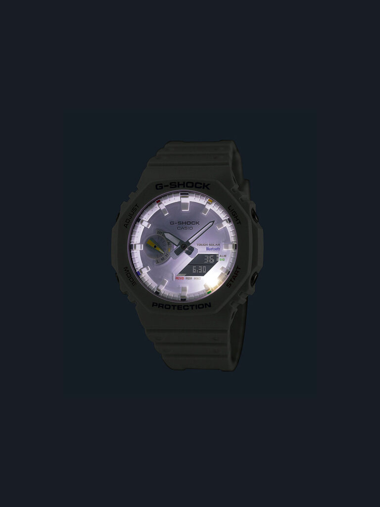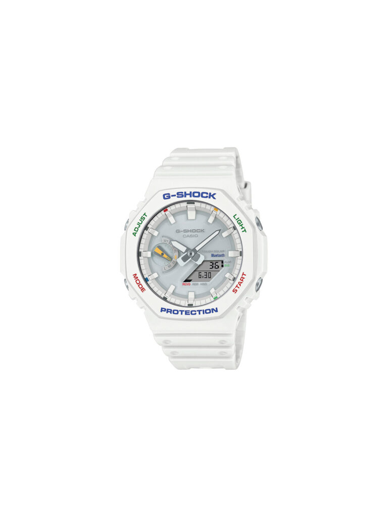 Popularan oktagonalni model G-SHOCK iz serije 2100 u beloj boji sa detaljima u više boja. Model ima Smartphone link , Tough Solar punjenje i Carbon Core Guard strukturu kućišta.
