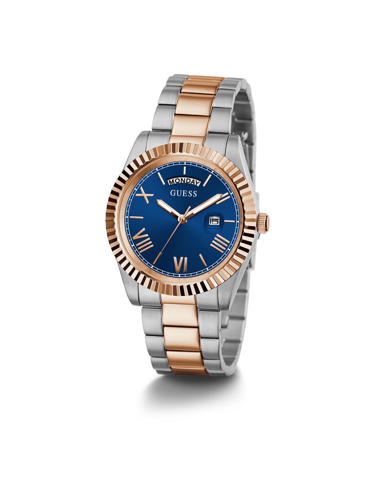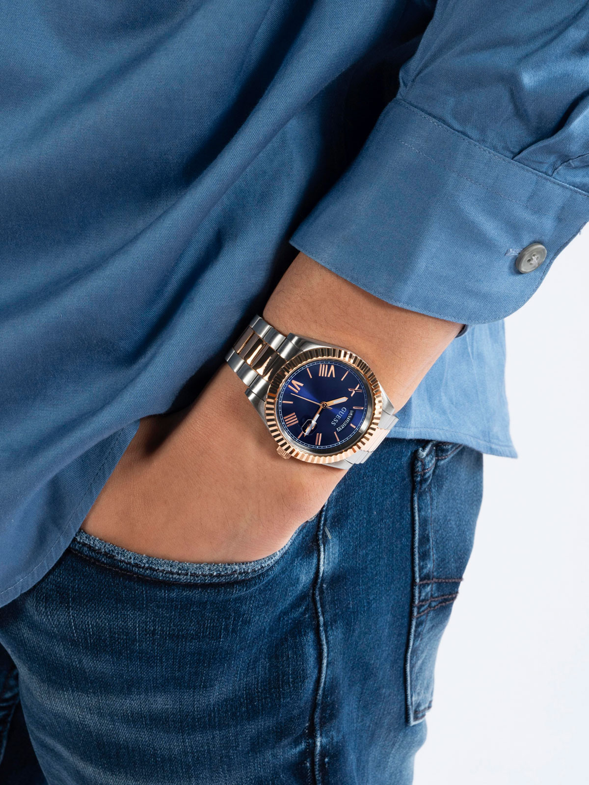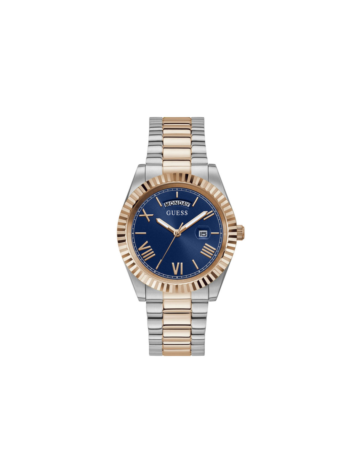 Klasičan model nikad ne izlazi iz mode. GW0265G12 Guess muški sat u dve boje čelika: boja srebra i boja roze zlata. Izrezbaren okvir kućišta integrisan je sa čeličnom narukvicom od 3 linka. Sat poseduje displej za dan na poziciji 12h i displej za datum na poziciji 3h.