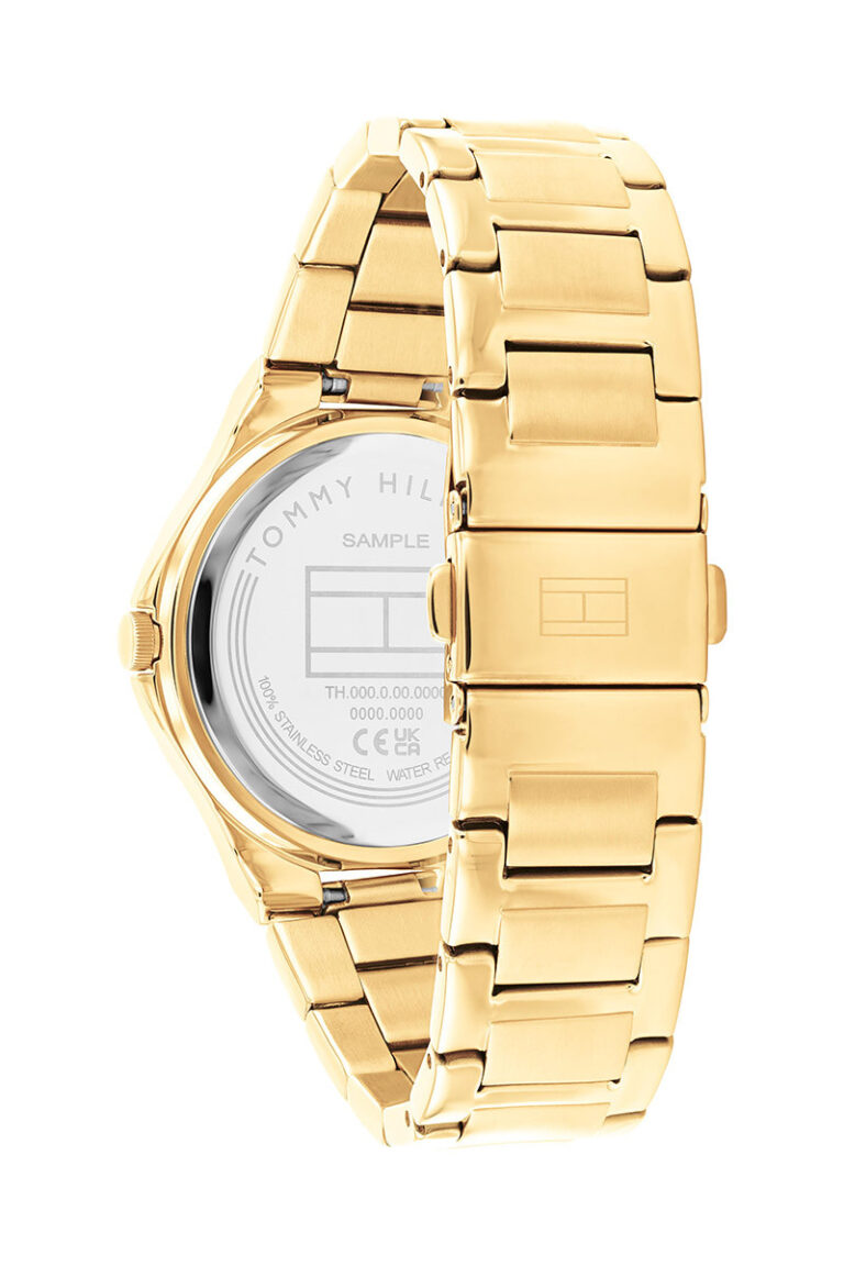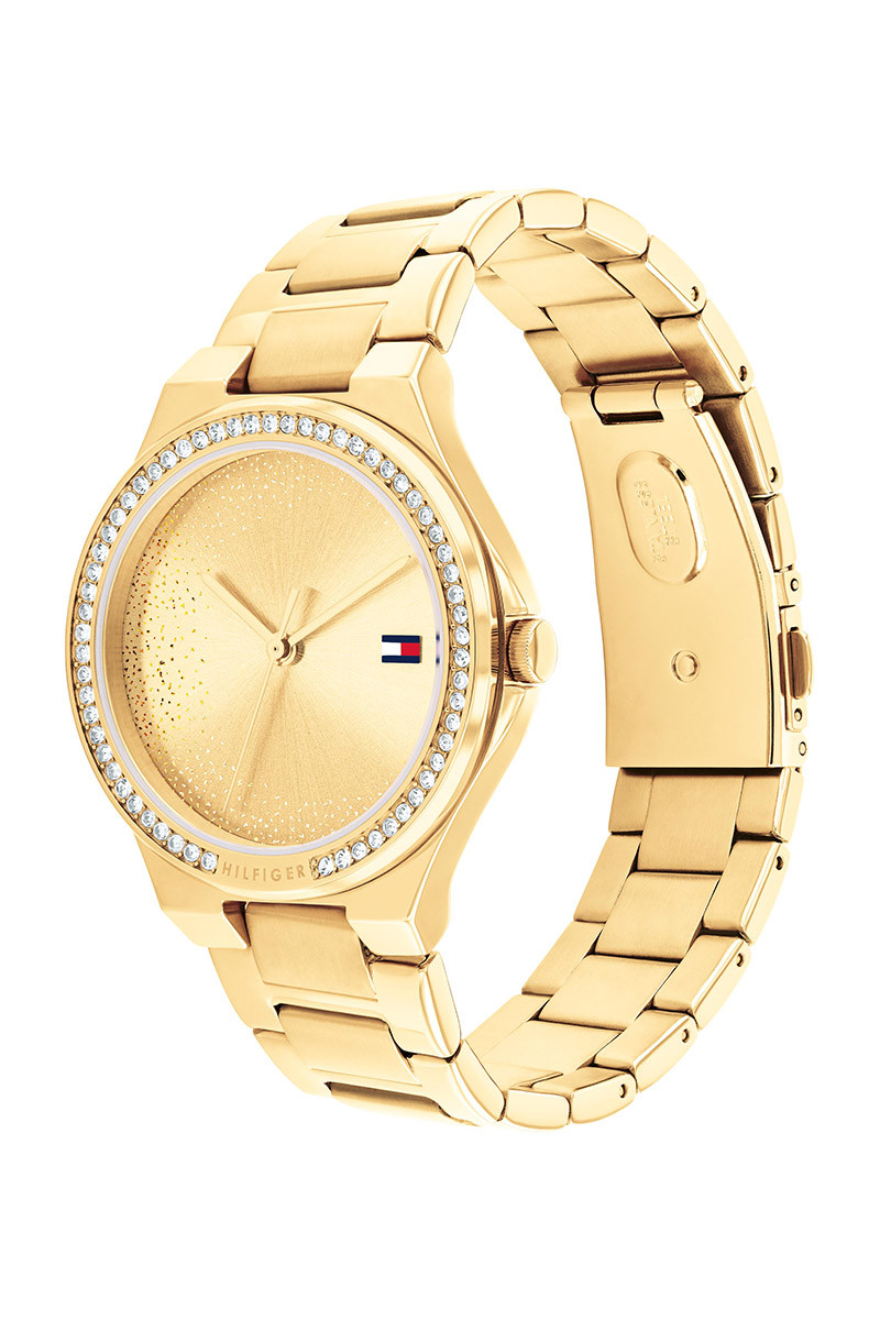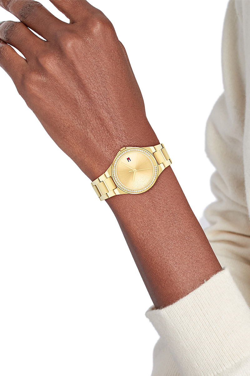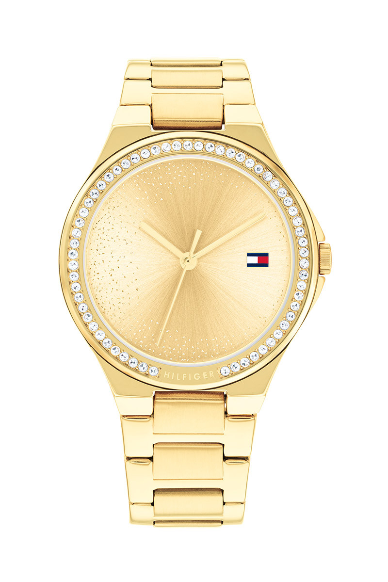 36mm Tommy Hilfiger ženski kvarcni sat ima zlatni brojčanik sa štrasom, kućište ukrašeno cirkonima i narukvicu od nerđajućeg čelika. Vodootpornost je 3 ATM